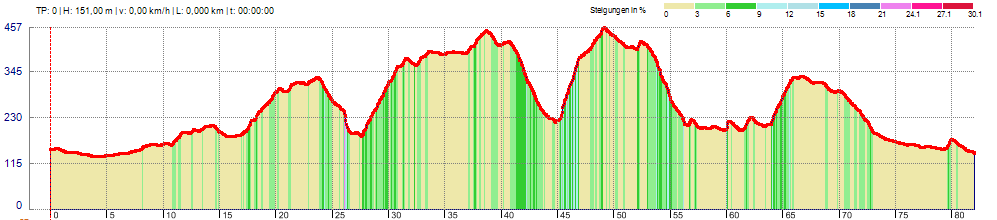 Topologie: Der ideale Trainingsberg wird erst dann zum Erlebnis, wenn er konstant ansteigt und in Serpentinen verläuft. Der Anstieg nach Bergstein ist schön, nicht zu steil und immer wieder ein Erlebnis. Auf dem Weg nach Hürtgenwald geht es am Motor-Cross-Centrum in Kleinhau vorbei. Hier geht es noch ruhig über einen Feldweg, danach wird der Verkehr deutlich stärker. Die Straßenbauer hatten ein Einsehen und kreierten einen gut ausgebauten Radweg. Er endet vor Vossenack was für die Tour kein Problem darstellt. Nach der Ortsdurchfahrt geht es bergab, um danach in einer extrem scharfen Rechtskurve wieder anzusteigen. Eine Talfahrt gibt es quasi nicht.
