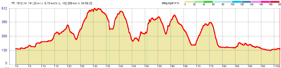 Topologie: Nachdem die Zülpicher Börde verlassen wird, nehmen wir den sehr ruhigen und schönen Feldweg zur Kleinstortschaft "Walbig". Die Abfahrt nach Heimbach ist ein Genuss, bevor das Bergtraining beim Aufstieg nach Maria Wald beginnt. Auf der Kermeterhöhe geht es links ab zur Abfahrt "Urfttalsperre. Die Straße schlängelt sich 180 HM zum Hauptsee herunter. Nach einer kurzen Einkehr geht es über den selben Weg zurück, bevor die Abfahrt zur Schiffanlegstelle Schwammenauel beginnt. Bevor diese erreicht wird, kommt die nächste Stichstraße mit Abfahrt zum Eifeler Tor, die im weiteren Verlauf zum Heimbacher Obersee führt. Der spätere Anstieg wird mit etwas über 10 Prozent erstmalig richtig Kraft kosten. An der Schiffanlegestelle Schwammenauel kann noch einmal getankt werden, denn bereits 1,5 Kilometer hinter der Staumauer geht es hinauf nach Schmidt. Als wir im Zentrum angekommen sind, geht es per Stichabfahrt zum Badestrand Eschauel. Die genommene Abfahrt liegt im Wald und bietet nur wenige Ausblicke, dafür ist die Ankunft um so schöner. Die Rückfahrt mit erneut bis zu 12 Prozent fordert Einsatzwillen, bevor nach der Abfahrt von Schmidt Richtung Brück der letzte Anstieg nach Bergstein folgt. Bei der Ankunft auf der Hochfläche zeigt sich ein sehr schöner Rundumblick der für die Mühe entlohnt. Das Höhentraining findet mit der 12 Prozent Abfahrt nach Obermaubauch ein Ende.