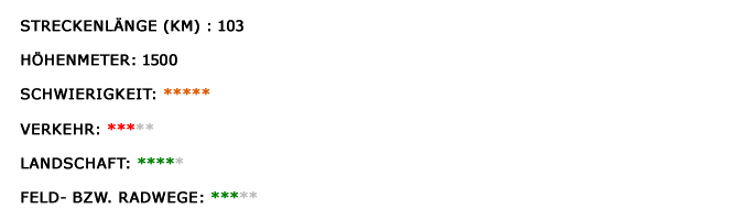 Die beschriebene Tour lässt fast keinen bekannten Berg dieser Region außer Acht. Die erste Welle geht über einen Feldweg nach Vlatten. Er steigt geradlinig an mit einigen Frostschäden, aber guter Aussicht. Der Pass zum berühmten Kloster "Maria Wald" stellt nur ein Einstieg dar. Die dargestellten Stichstraßen zur Urfttalsperre, Heimbacher Obersee und Badestrand Eschauel sind zudem die Touristenhöhepunkte dieser Region. Durch den flachen Tourstart und späteren Ausstieg täuscht das Bild der "nur" 1500 HM auf 100 Kilometern. Die Tour ist auf jeden Fall als anspruchsvoll einzustufen.